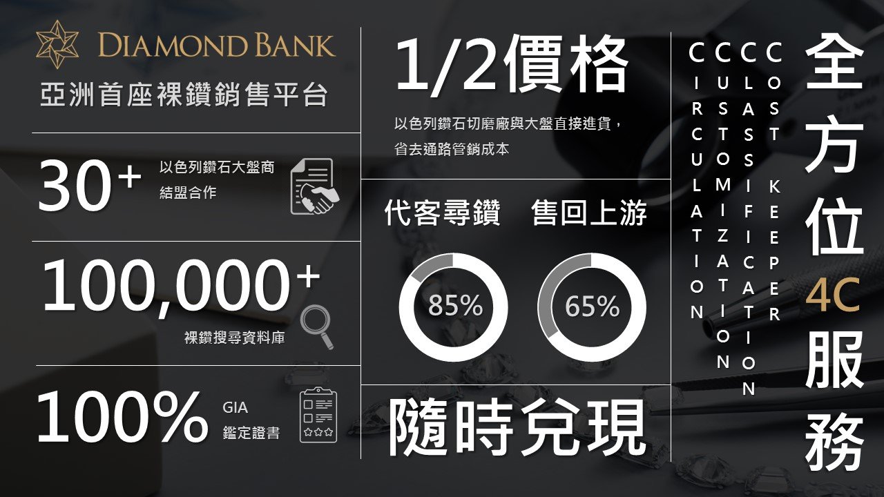 DIAMOND BANK由全世界最大礦場、盤商與頂級切磨廠策略聯盟所成立,於2015年六月在台成立亞洲首座完美車工鑽石銷售平台,以提供大型品牌規格化的鑽石為主,並打破以往單一珠寶商與上游進貨的交易模式,改與各大盤商聯合大量採購,以團購的價格,降低進貨成本,並以專業以及完整的服務,提供台灣消費者更多關於購買裸鑽的正確觀念,也讓各個鑽石行家不再需要為了尋找有保障的商家而煩惱。