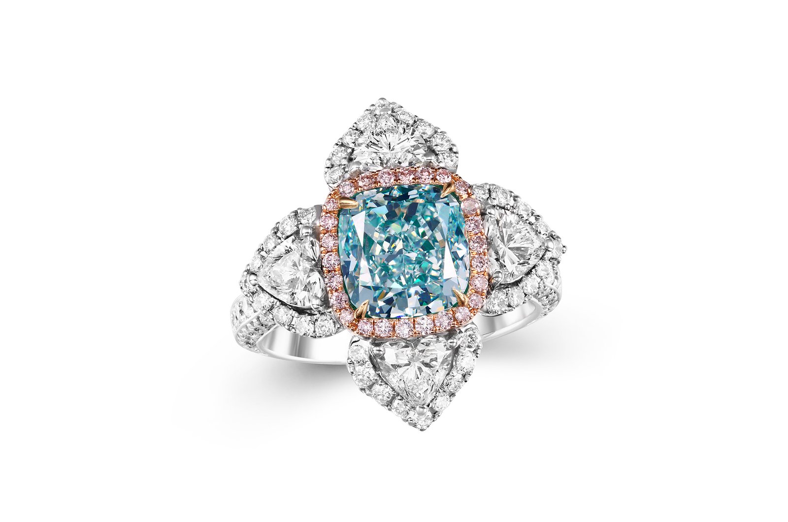 主石為3.10克拉Very Light Green VVS2枕形彩鑽。周圍鑲嵌26顆共重0.14克拉的粉紅色配鑽及4顆共重1.23克拉的圓形配鑽,再以120顆共重0.85克拉的圓形配鑽點綴;售價NTD$1,731,180元(未稅),附GIA證書。