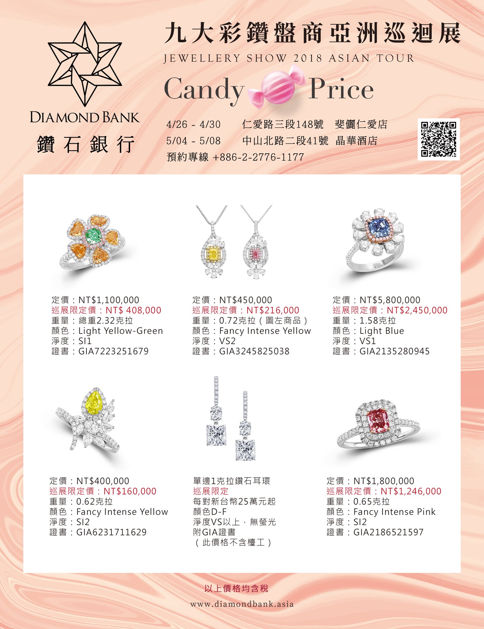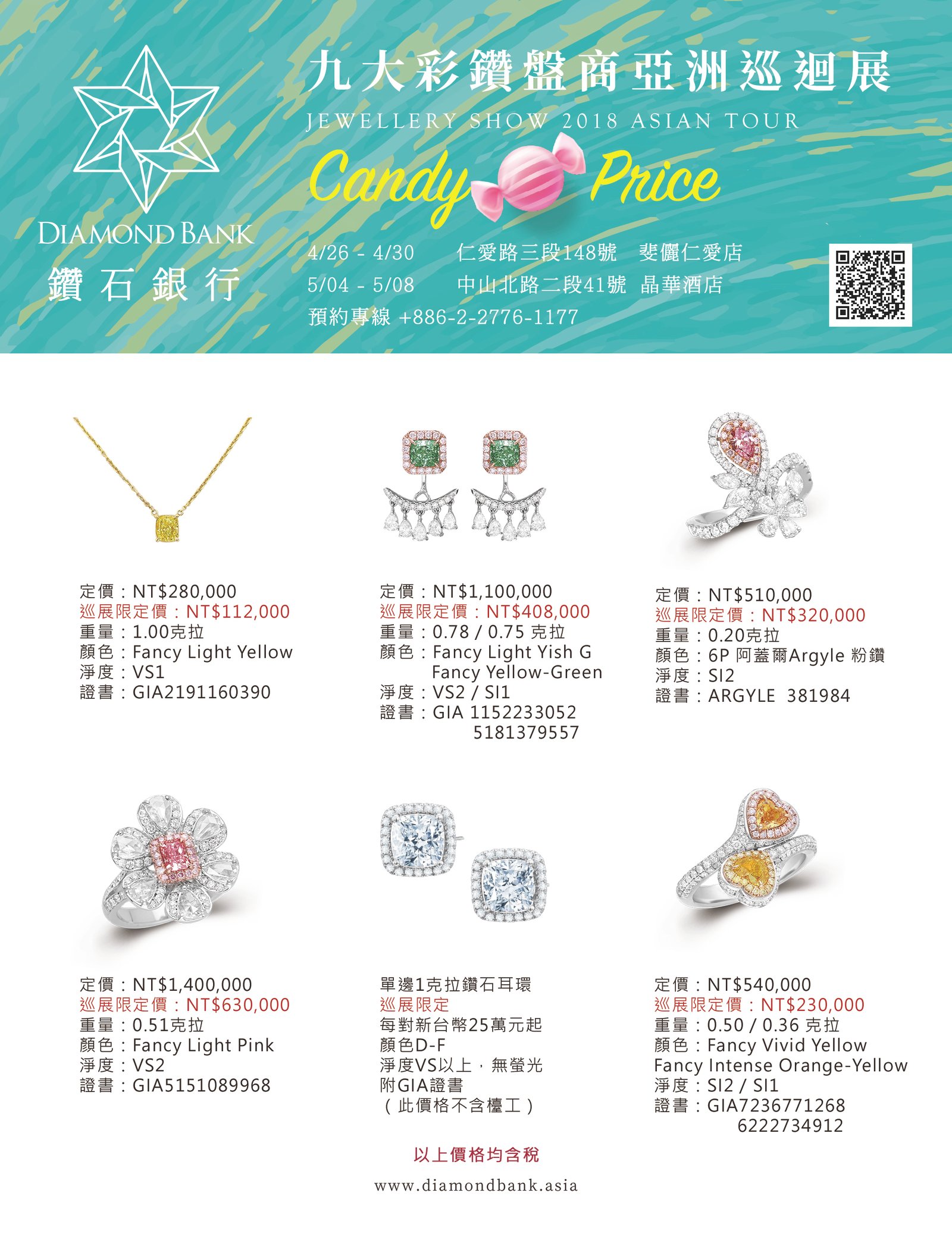 睽違一年,《Diamond Bank鑽石銀行 九大彩鑽盤商 2018亞洲巡迴展》將再次於 4/26 至 5/8 第三度來台。此次參展廠商,絕大部分為國際拍賣會(如蘇富比、佳士得)的供應商,Diamond Bank 仍透過世界一流廠商團體購買與整合議價的平台優勢,實踐M2M(“Mine to the Market” 「從礦場到市場」)理念,使台灣消費者可享受到「低於拍賣會『起標價』」的價格;巡迴展尚未開跑,自四月初起就已經受到市場熱烈詢問,並獲得國內幾位特定收藏家的關注。