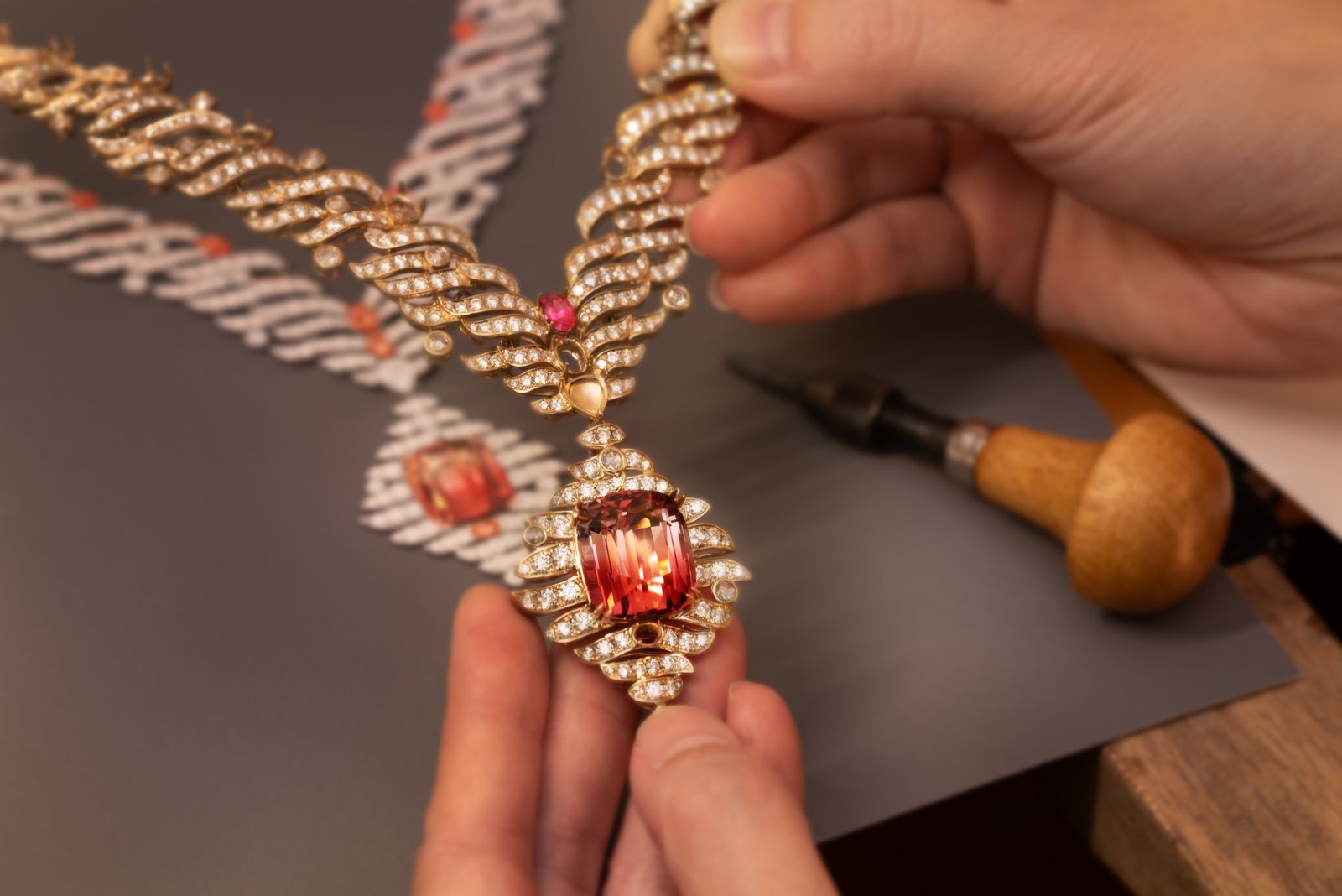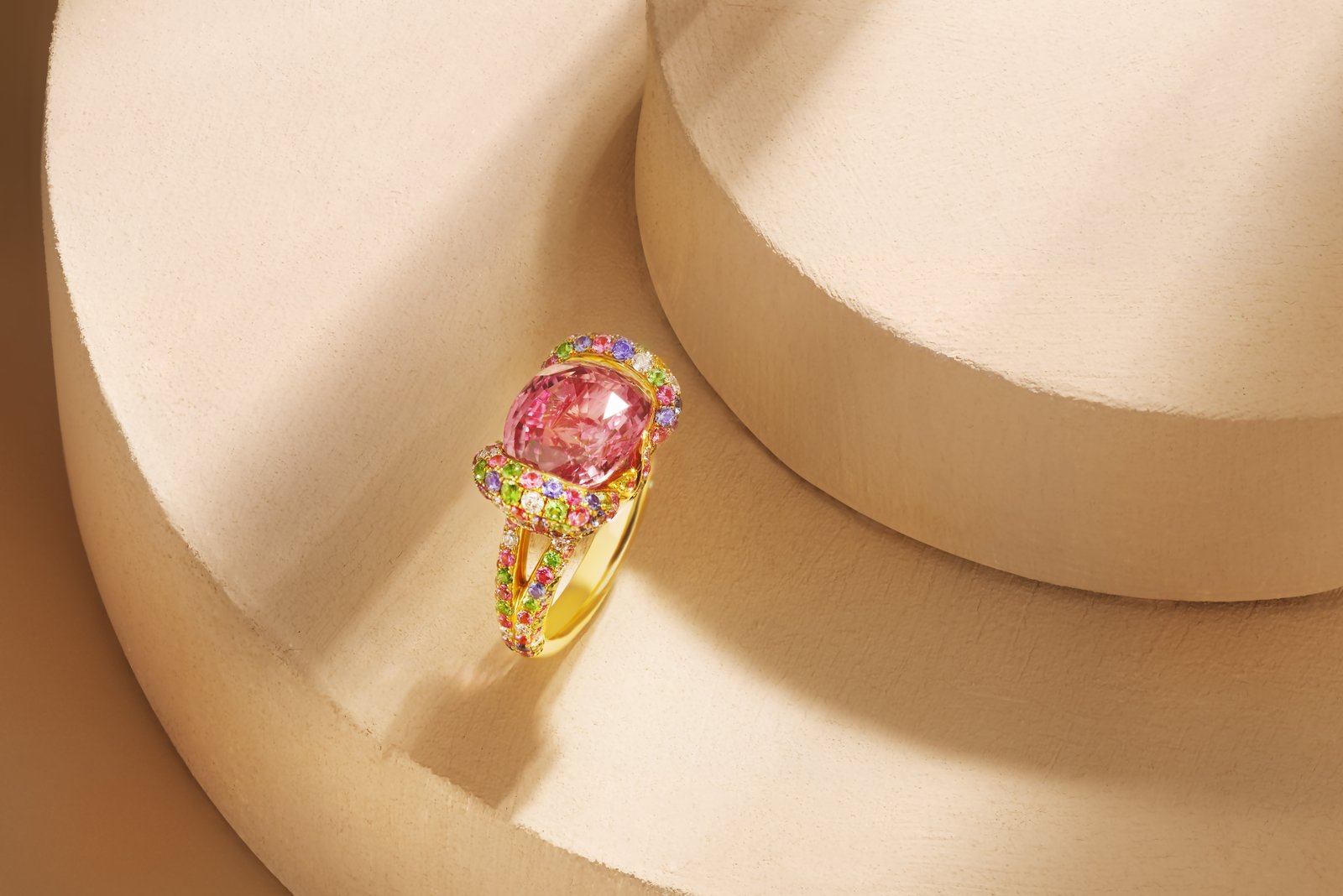 《日光》系列以自然界光線變化為靈感,從日光穿透露珠、海面反光到冰川折射汲取意象,以斜線鑲嵌與幾何線條呈現光的方向性與純淨度。《綻・圓舞曲》系列則取材自禮服裙襬掀起的律動,以流動曲線與立體結構描繪柔軟與張力並存的姿態,象徵女性步伐中的優雅與力量,為高條件寶石增添更具藝術性的延伸。
