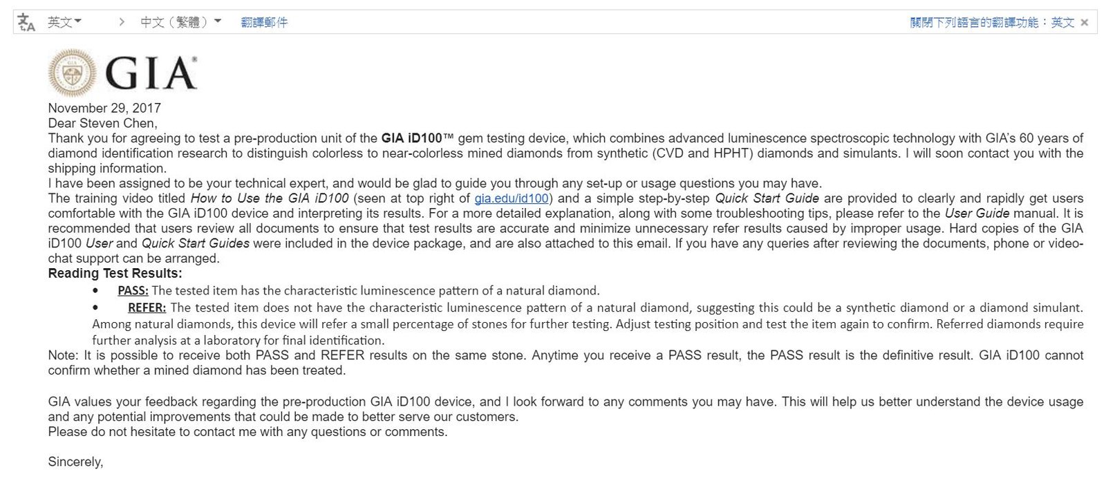 GIA官方委託Diamond Bank參與鑑定儀器原型測試工作的信件