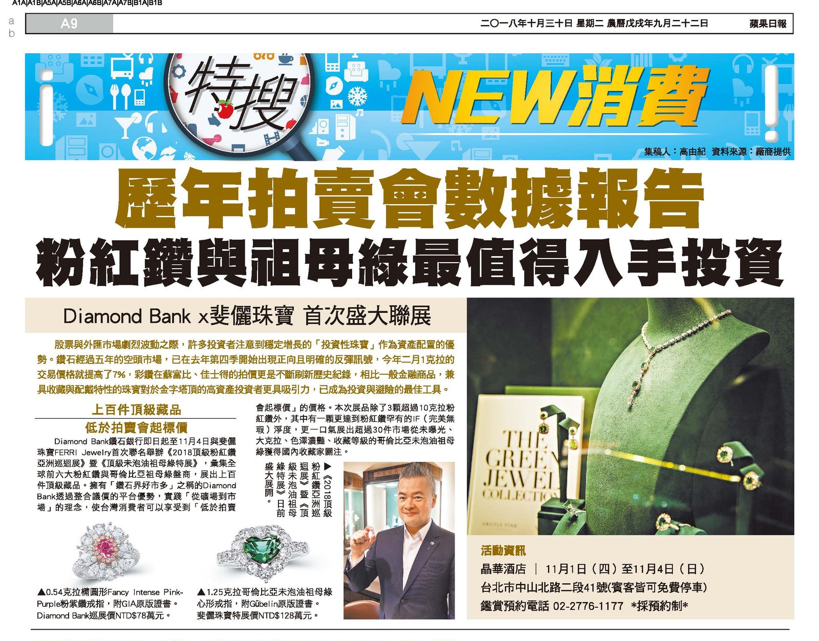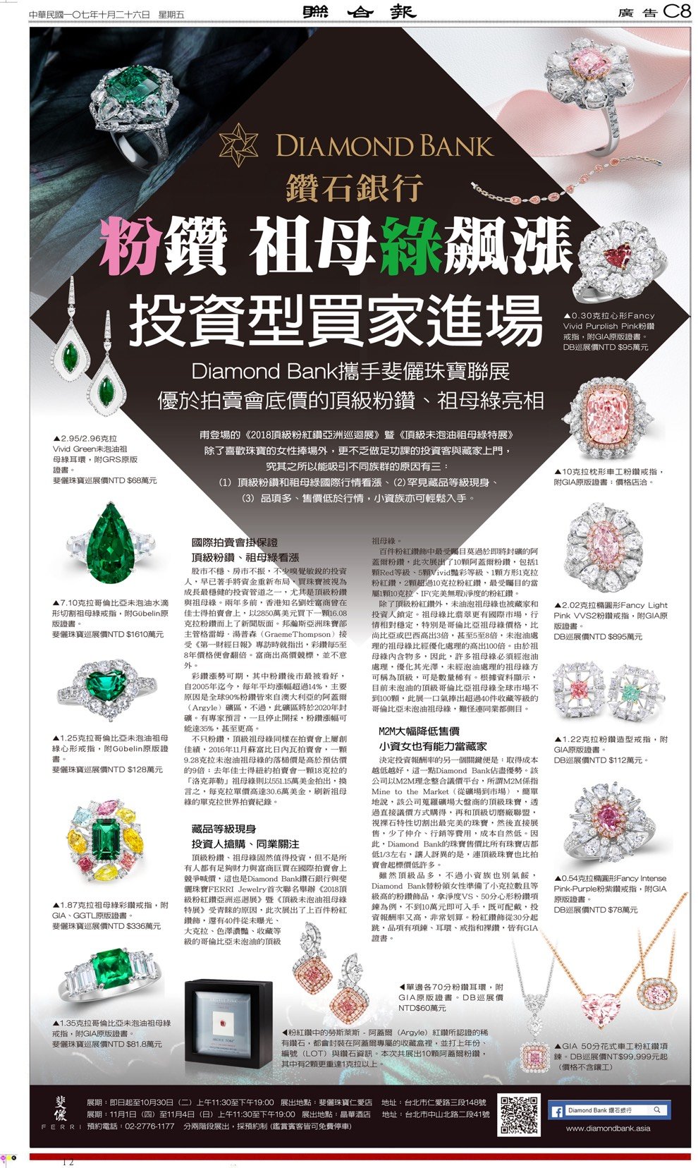 2018.10 鑽石銀行x斐儷珠寶 阿蓋爾粉紅鑽、哥倫比亞未泡油祖母綠《媒體報導》發佈日期為 2018 年 10 月 30 日