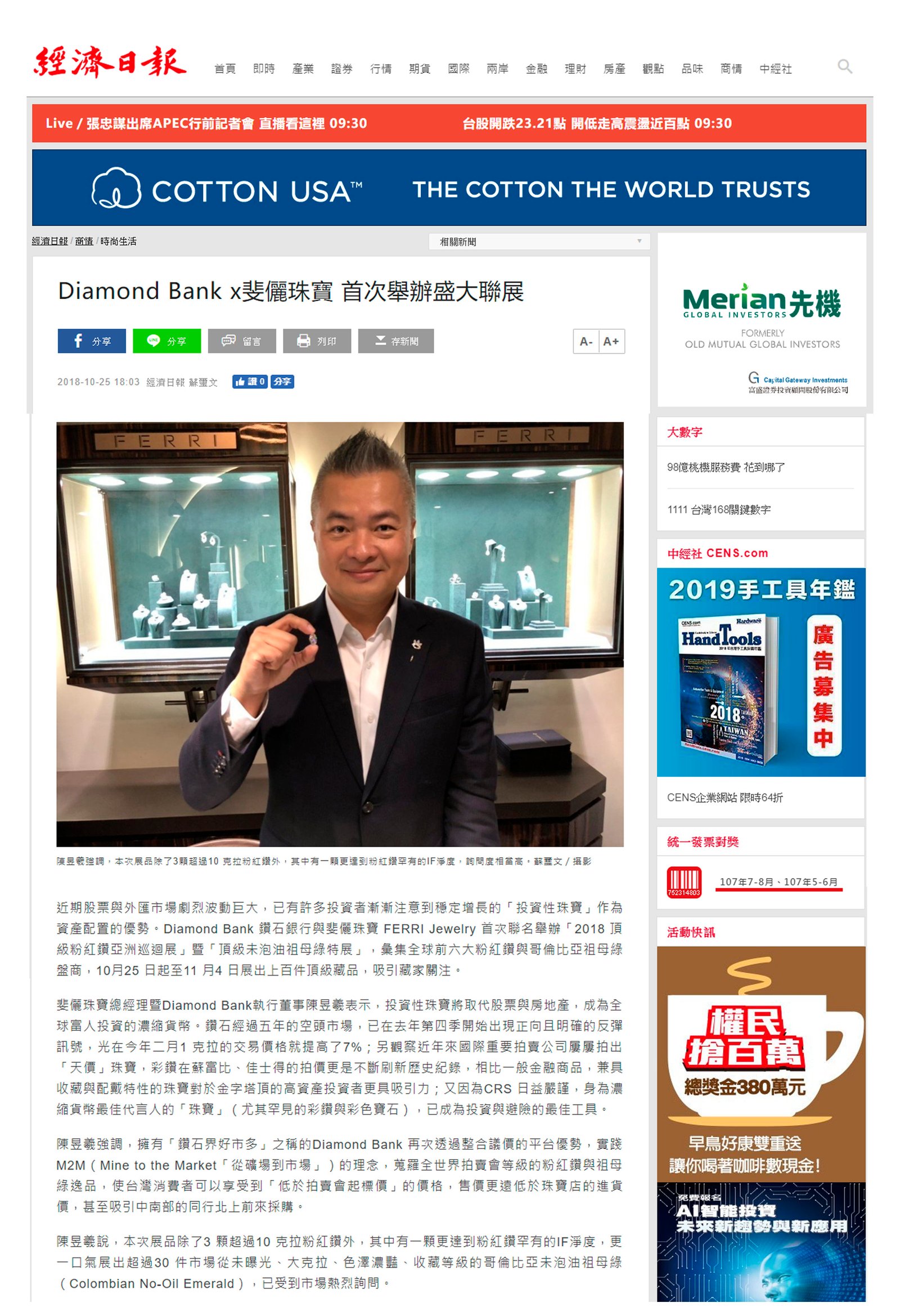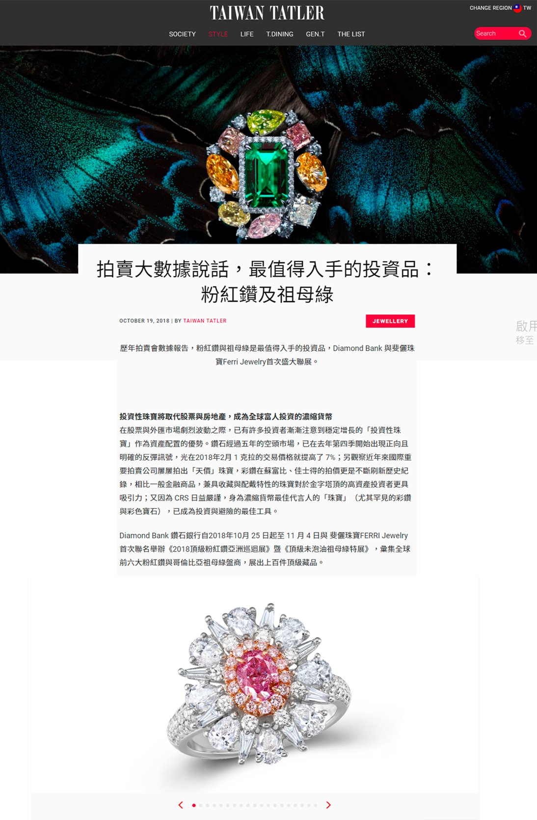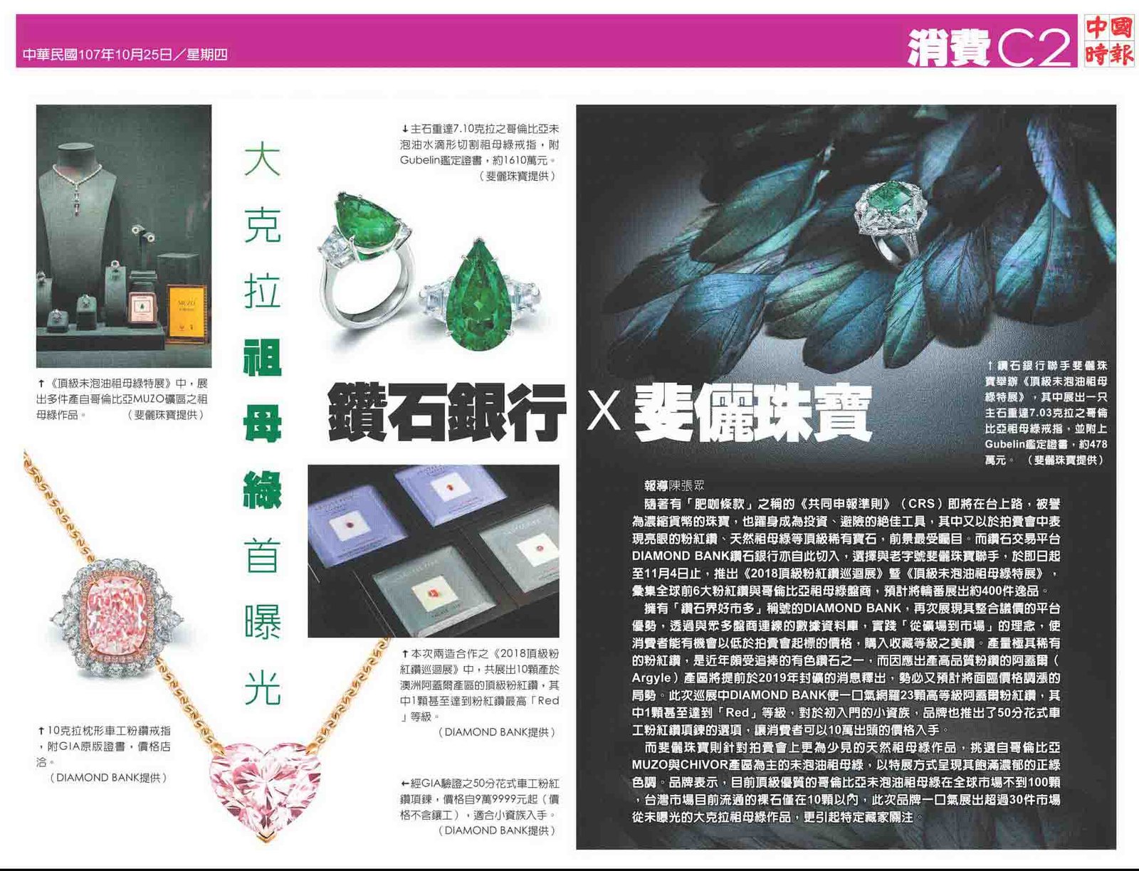 Diamond Bank 鑽石銀行 與 斐儷珠寶 FERRI Jewelry 首次聯名舉辦《2018頂級粉紅鑽亞洲巡迴展》暨《頂級未泡油祖母綠特展》,彙集全球前六大粉紅鑽與哥倫比亞祖母綠盤商,展出上百件頂級藏品。擁有「鑽石界好市多」之稱的Diamond Bank再次透過整合議價的平台優勢,實踐M2M(Mine to the Market「從礦場到市場」)的理念,蒐羅全世界拍賣會等級的粉紅鑽與祖母綠逸品,使台灣消費者可以享受到「低於拍賣會起標價」的價格,售價更遠低於珠寶店的進貨價,甚至吸引中南部的同行北上前來採購。本次展品除了3顆超過10克拉粉紅鑽外,其中有一顆更達到粉紅鑽罕有的IF(完美無瑕)淨度,更一口氣展出超過30件市場從未曝光、大克拉、色澤濃豔、收藏等級的哥倫比亞未泡油祖母綠(Colombian No-Oil Emerald);活動尚未開跑前就已經受到市場熱烈詢問,並獲得國內幾位特定收藏家的關注。