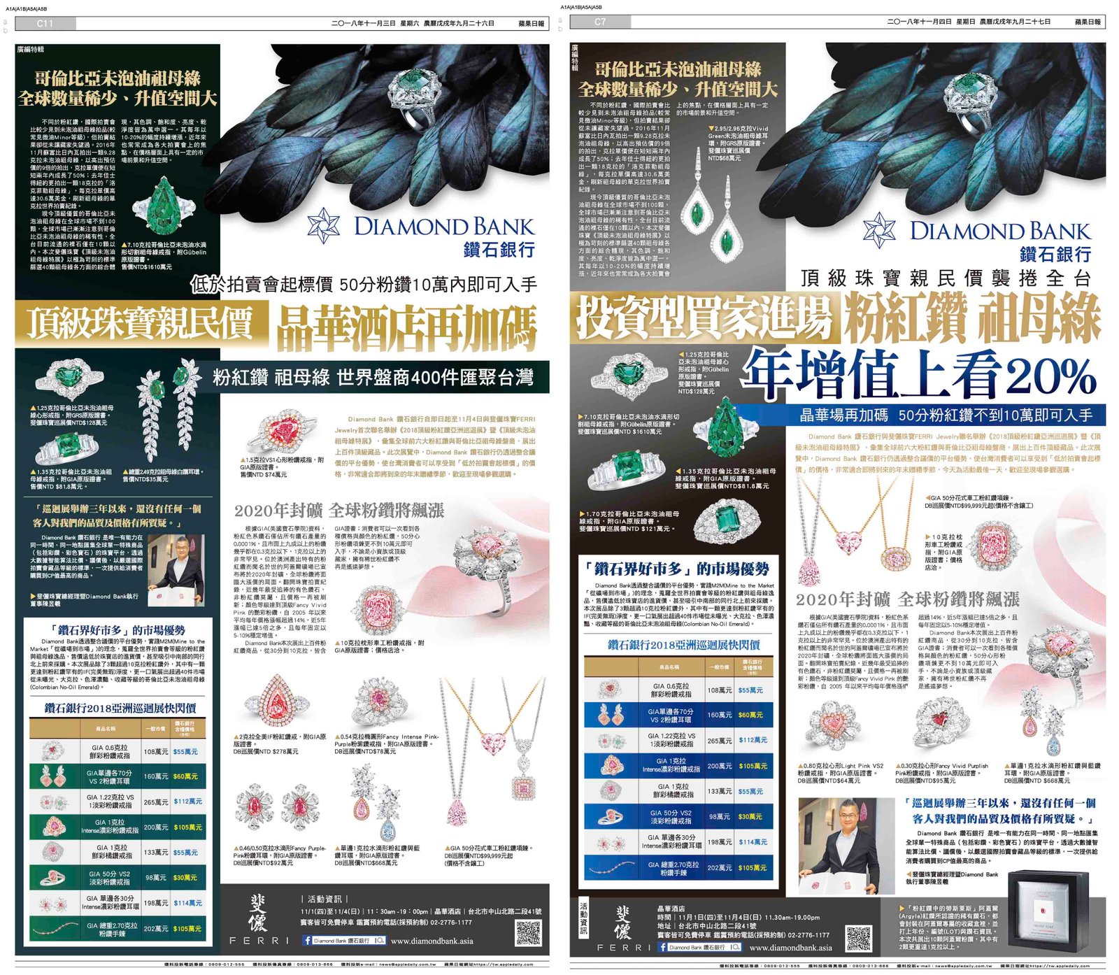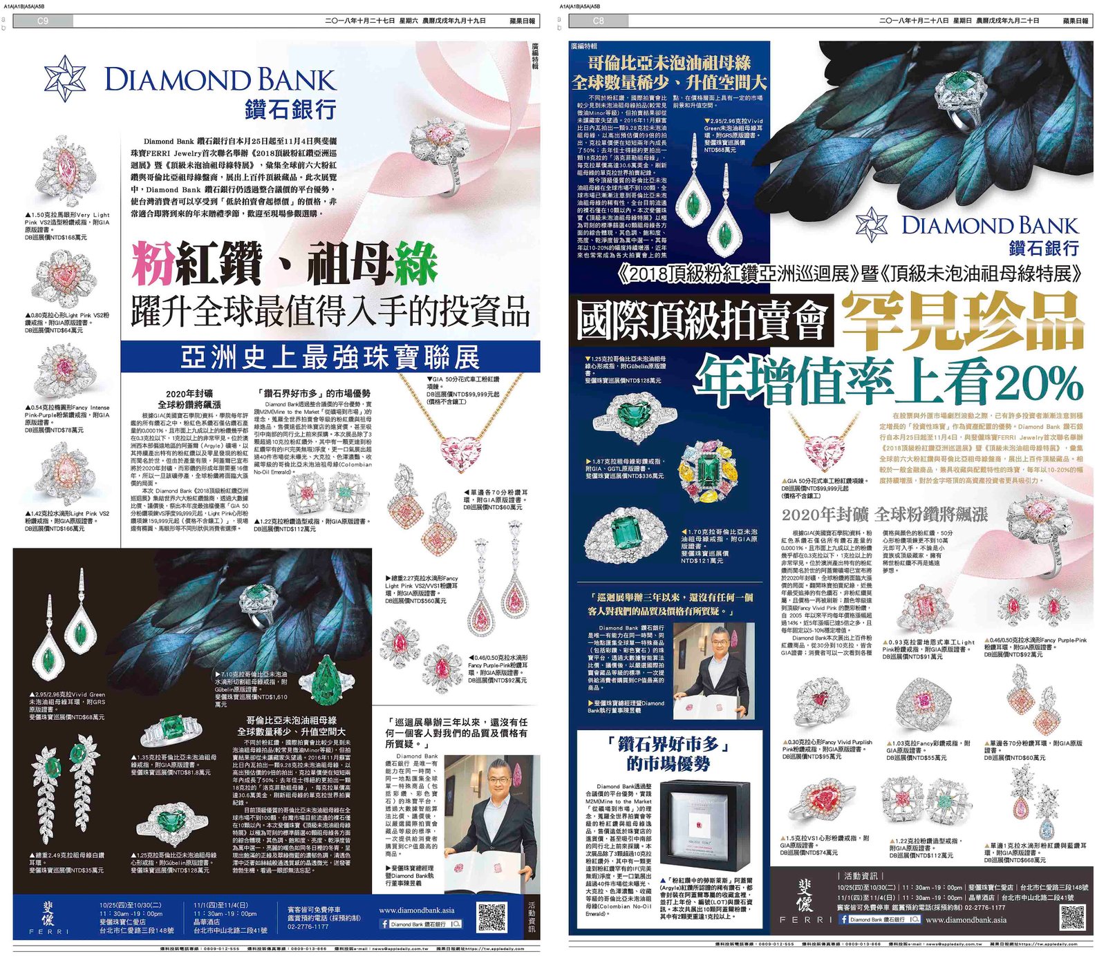 Diamond Bank 鑽石銀行10月25日~11月4日與 斐儷珠寶FERRI Jewelry 首次攜手聯名舉辦《2018頂級粉紅鑽亞洲巡迴展》暨《頂級未泡油祖母綠特展》,彙集全球前六大粉紅鑽與哥倫比亞祖母綠盤商,展出上百件頂級藏品。擁有「鑽石界好市多」之稱的Diamond Bank再次透過整合議價的平台優勢,實踐M2M(Mine to the Market「從礦場到市場」)的理念,蒐羅全世界拍賣會等級的粉紅鑽與祖母綠逸品,使台灣消費者可以享受到「低於拍賣會起標價」的價格,售價更遠低於珠寶店的進貨價,甚至吸引中南部的同行北上前來採購。本次展品除了3顆超過10克拉粉紅鑽外,其中有一顆更達到粉紅鑽罕有的IF(完美無瑕)淨度,更一口氣展出超過30件市場從未曝光、大克拉、色澤濃豔、收藏等級的哥倫比亞未泡油祖母綠(Colombian No-Oil Emerald);活動開跑前就已經受到市場熱烈詢問,並獲得國內幾位特定收藏家的關注。