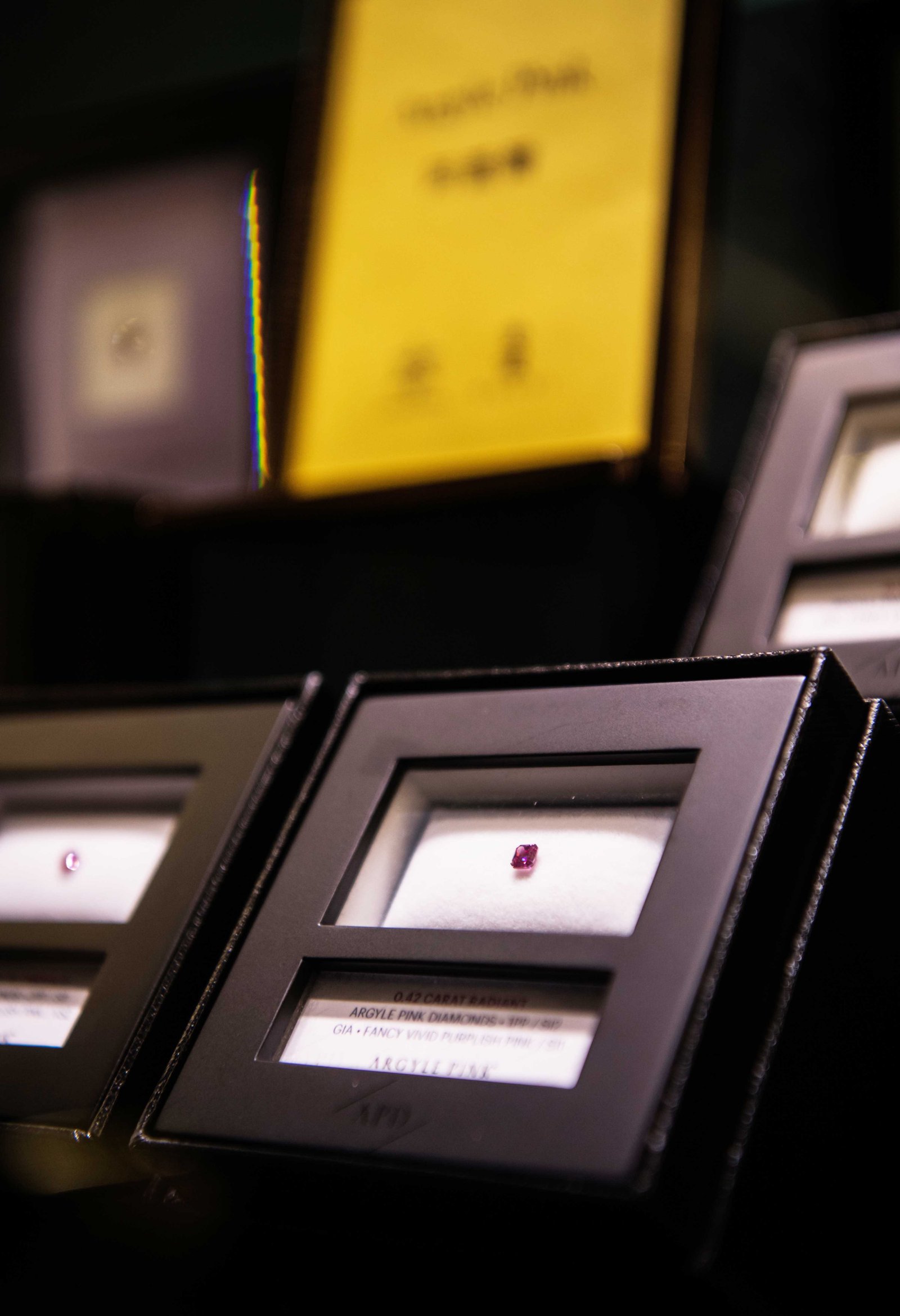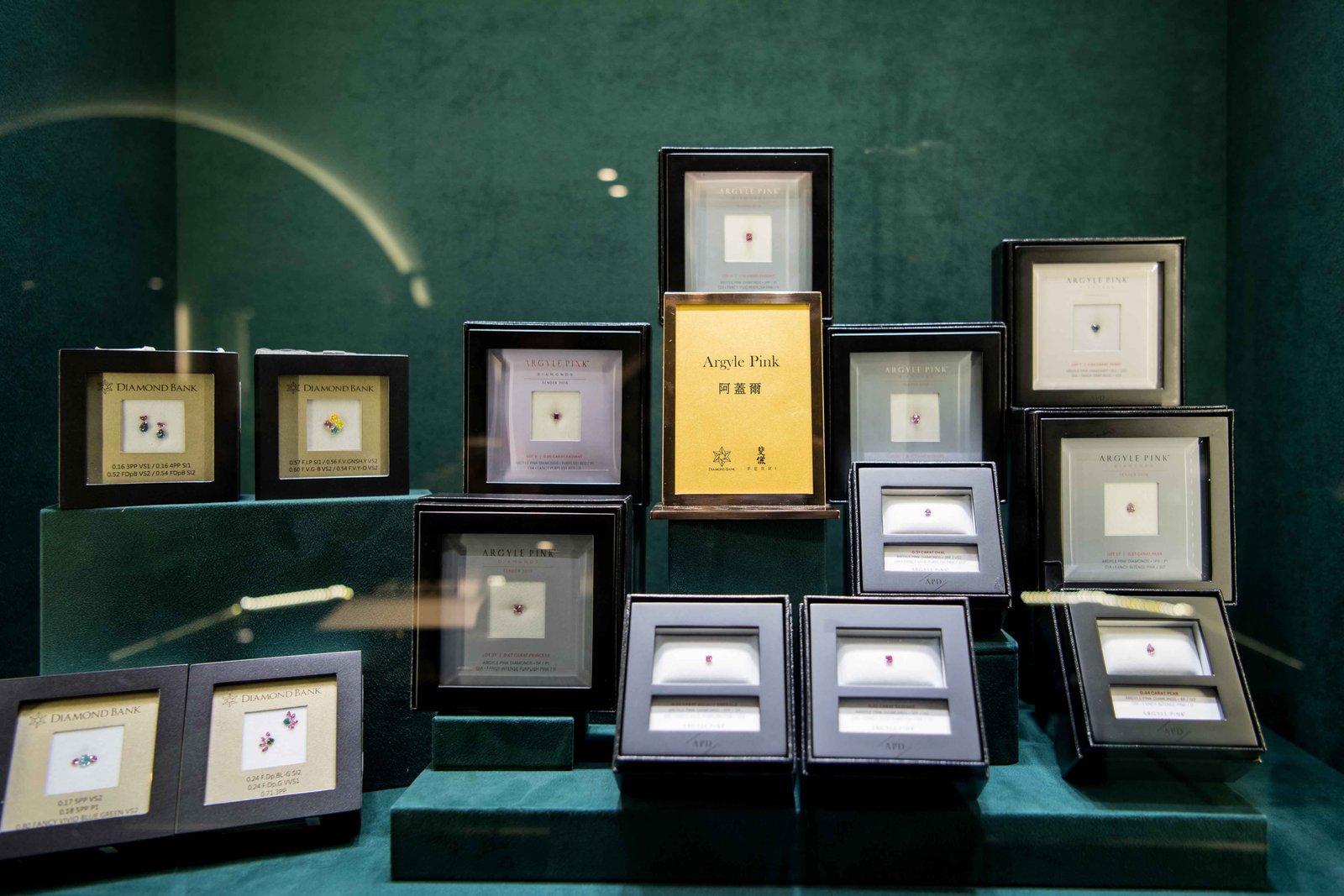 粉紅鑽中的勞斯萊斯 - 阿蓋爾(Argyle)所認證的稀有鑽石,都會封裝在阿蓋爾專屬的收藏盒裡,並打上年份、編號(LOT)與鑽石資訊。本次共展出10顆阿蓋爾粉鑽,1顆達到粉紅鑽最高「Red」等級,5顆Vivid豔彩等級,更有一顆阿蓋爾方形粉紅鑽重達1克拉以上。(上圖)