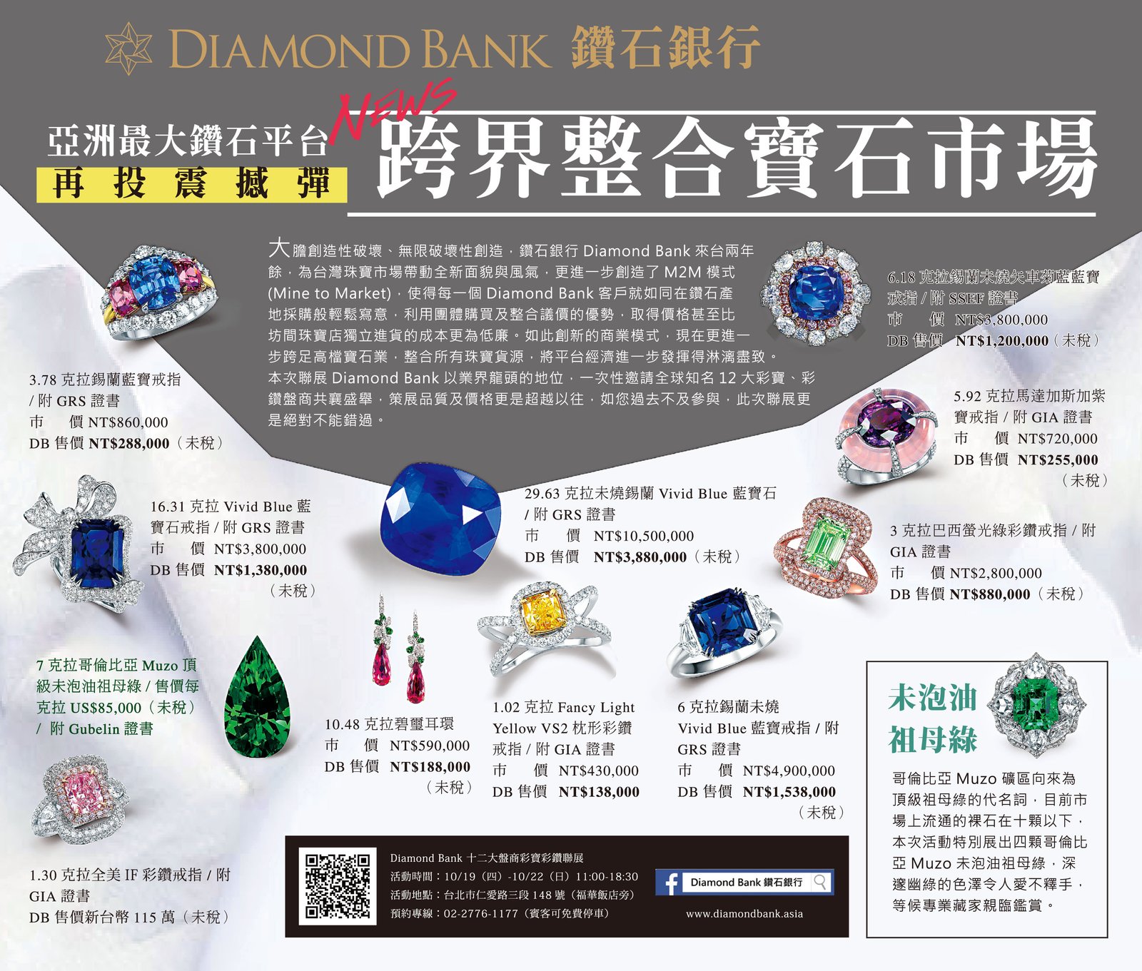 Diamond Bank 鑽石銀行於10/19-10/22在台舉辦「十二大盤商彩寶彩鑽聯展」,一次性邀請全球知名12大彩寶彩鑽盤商共襄盛舉,利用團體購買及整合議價的優勢,讓台灣的消費者可以用比珠寶店進貨成本更低的價格,輕鬆購得頂級珠寶。