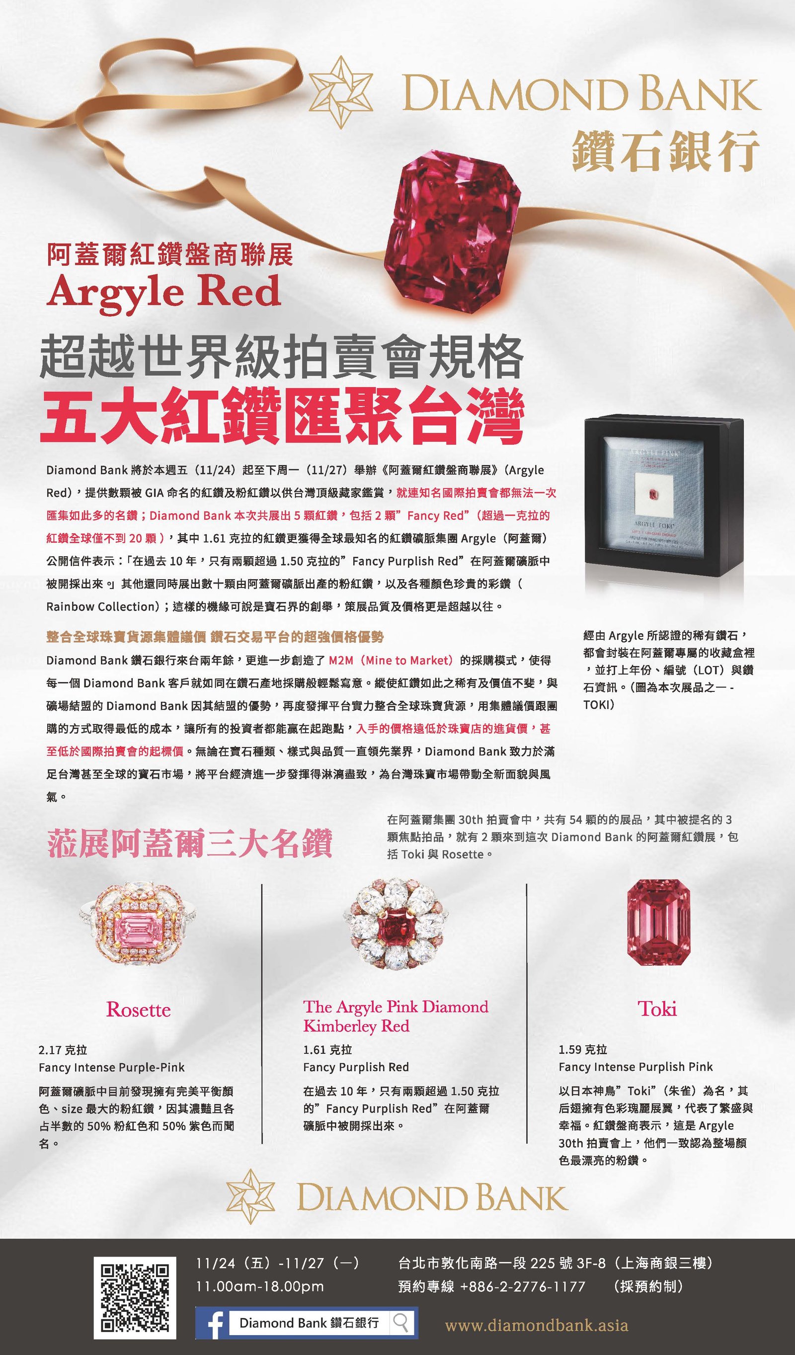 Diamond Bank將於本週五(11/24)起舉辦《阿蓋爾紅鑽盤商聯展》(Argyle Red),提供數顆被GIA命名的紅鑽及粉紅鑽以供台灣頂級藏家鑑賞,就連知名國際拍賣會都無法一次匯集如此多的名鑽;我們對台灣市場充滿信心,再度發揮平台實力整合全球珠寶貨源,用集體議價跟團購的方式取得最低的成本,讓消費者買到的價格遠低於珠寶店的進貨價,甚至低於國際拍賣會的起標價;現場更同時展出數十顆由阿蓋爾礦脈出產的粉紅鑽,以及各種顏色珍貴的彩鑽。